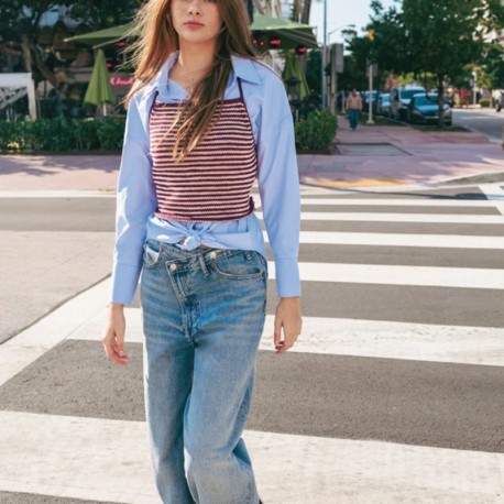 Das Top kann gestreift oder einfarbig gestrickt werden. Es wird zweifädig mit Mandarin Petit und Tynn Line gestrickt. Die angegebenen Garnmengen entsprechen dem Gesamtverbrauch.