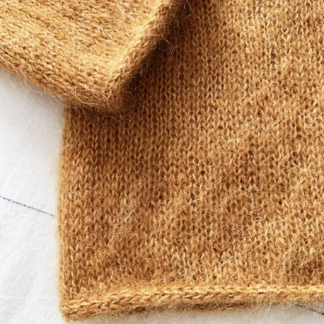 Er ist ein leichter Pullover für fortgeschrittene Anfänger, der mit zwei Fäden Mohair von oben nach unten in der Runde gestrickt wird. Er hat einen Rundhalsausschnitt und wird an den Ärmelbündchen und am unteren Saum mit einer i-Cord-Kante abgeschlossen.