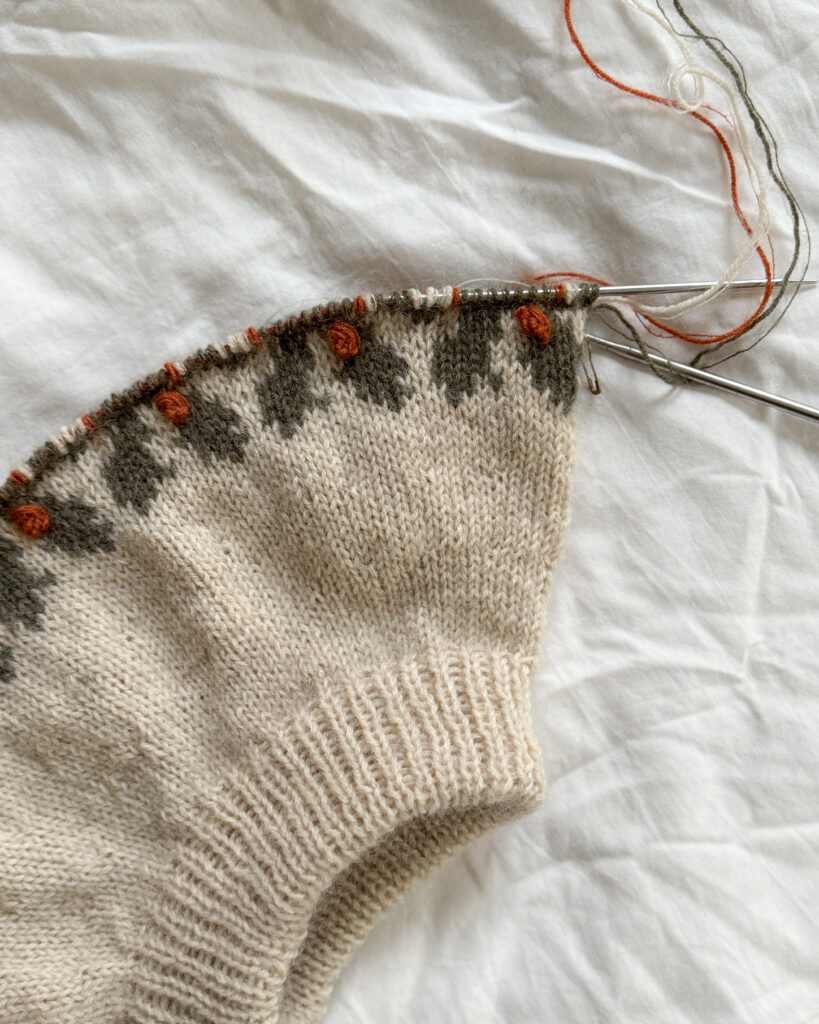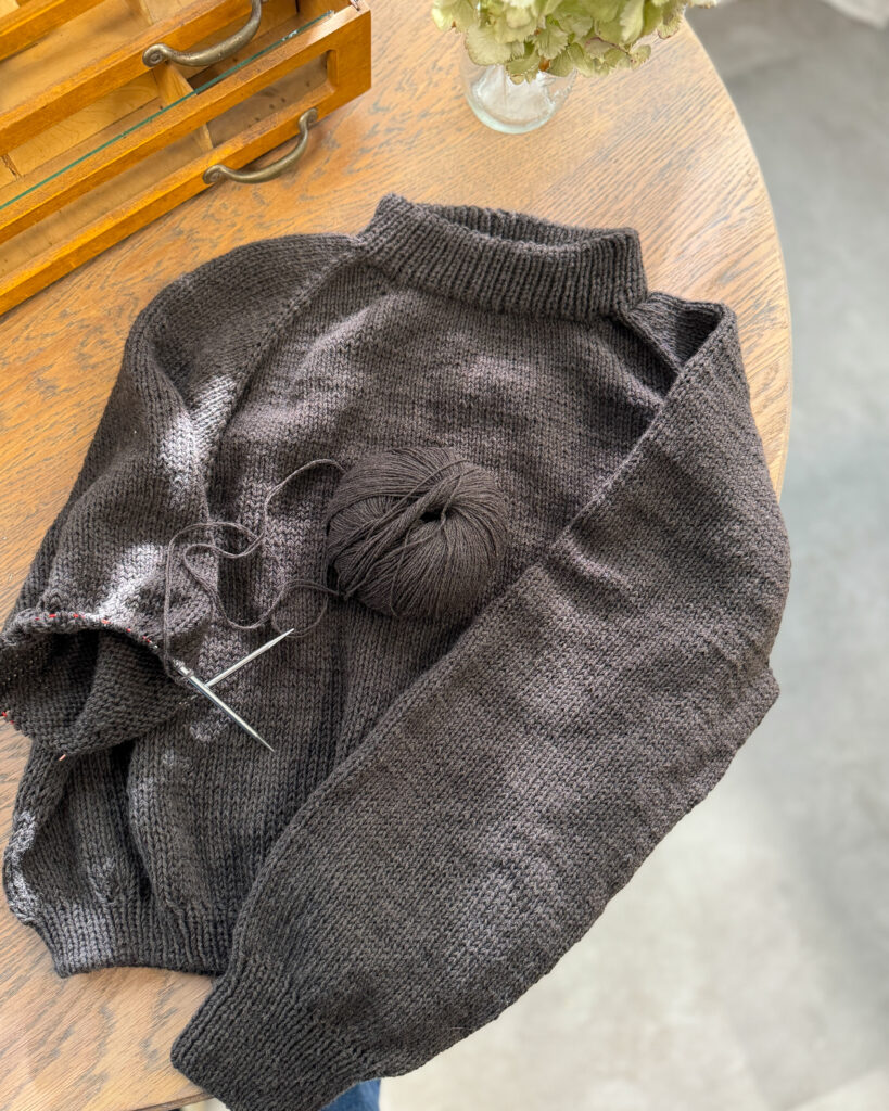 Ich (Simone) stricke zum dritten Mal den Holly Sweater von Knitting for Olive, mit einem Faden Merino und einem Faden Soft Silk Mohair von Knitting for Olive in den Farben Marcipan, Dusty Olive und Rust.