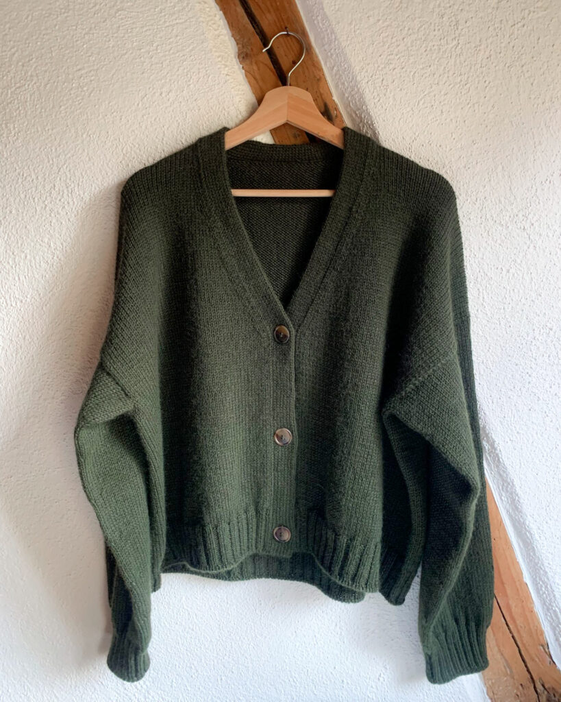 Michèle hat vor Kurzem den Moospath Cardigan von Jonna Helin fertig gestrickt aus der Laine x Novita DK in der Farbe Pine Forest.